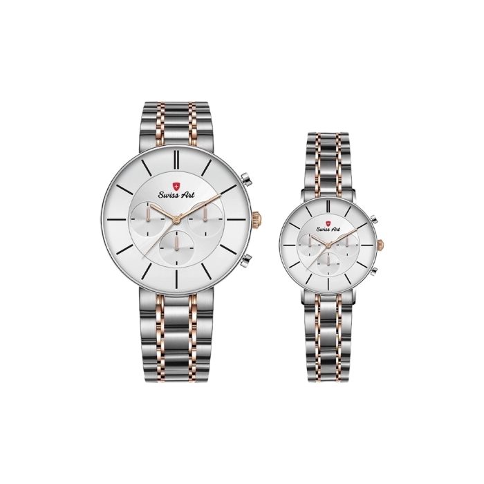 ست ساعت مردانه و زنانه برند سوئیس آرت (Swiss Art)، ترکیبی خیرهکننده از ظرافت سوئیسی و کیفیت بینظیر است که برای زوجهای خوشسلیقه طراحی شده است. این ست لوکس با بهرهگیری از موتور دقیق و معتبر سوئیسی Ronda، نهایت دقت و دوام را تضمین میکند. شیشه ضد خش سافایر و قابلیت ضد آب بودن، مقاومت فوقالعادهای در برابر شرایط مختلف به آن بخشیدهاند تا با خیال آسوده در زندگی روزمره و موقعیتهای خاص از آن استفاده کنید.