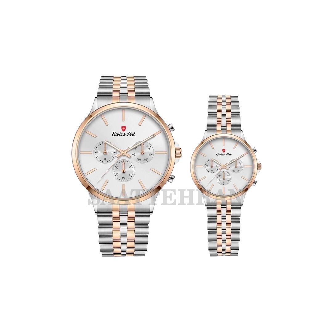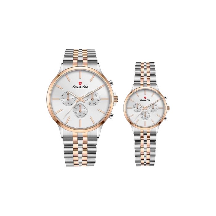 ست ساعت مردانه و زنانه برند سوئیس آرت (Swiss Art)، ترکیبی خیره‌کننده از ظرافت سوئیسی و کیفیت بی‌نظیر است که برای زوج‌های خوش‌سلیقه طراحی شده است. این ست لوکس با بهره‌گیری از موتور دقیق و معتبر سوئیسی Ronda، نهایت دقت و دوام را تضمین می‌کند. شیشه ضد خش سافایر و قابلیت ضد آب بودن، مقاومت فوق‌العاده‌ای در برابر شرایط مختلف به آن بخشیده‌اند تا با خیال آسوده در زندگی روزمره و موقعیت‌های خاص از آن استفاده کنید.