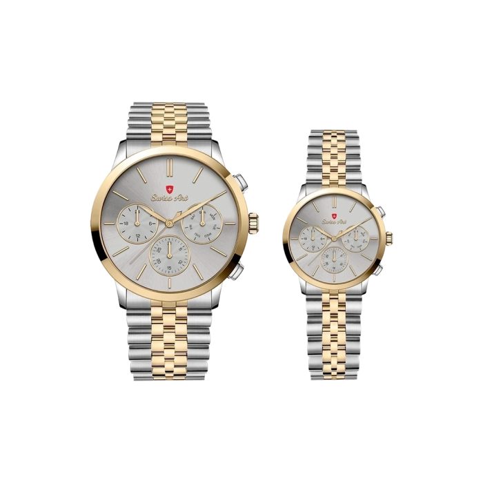 ست ساعت مردانه و زنانه برند سوئیس آرت (Swiss Art)، ترکیبی خیرهکننده از ظرافت سوئیسی و کیفیت بینظیر است که برای زوجهای خوشسلیقه طراحی شده است. این ست لوکس با بهرهگیری از موتور دقیق و معتبر سوئیسی Ronda، نهایت دقت و دوام را تضمین میکند. شیشه ضد خش سافایر و قابلیت ضد آب بودن، مقاومت فوقالعادهای در برابر شرایط مختلف به آن بخشیدهاند تا با خیال آسوده در زندگی روزمره و موقعیتهای خاص از آن استفاده کنید.