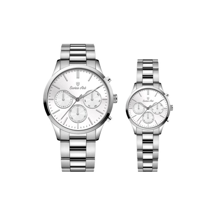 ست ساعت مردانه و زنانه برند سوئیس آرت (Swiss Art)، ترکیبی خیرهکننده از ظرافت سوئیسی و کیفیت بینظیر است که برای زوجهای خوشسلیقه طراحی شده است. این ست لوکس با بهرهگیری از موتور دقیق و معتبر سوئیسی Ronda، نهایت دقت و دوام را تضمین میکند. شیشه ضد خش سافایر و قابلیت ضد آب بودن، مقاومت فوقالعادهای در برابر شرایط مختلف به آن بخشیدهاند تا با خیال آسوده در زندگی روزمره و موقعیتهای خاص از آن استفاده کنید.
